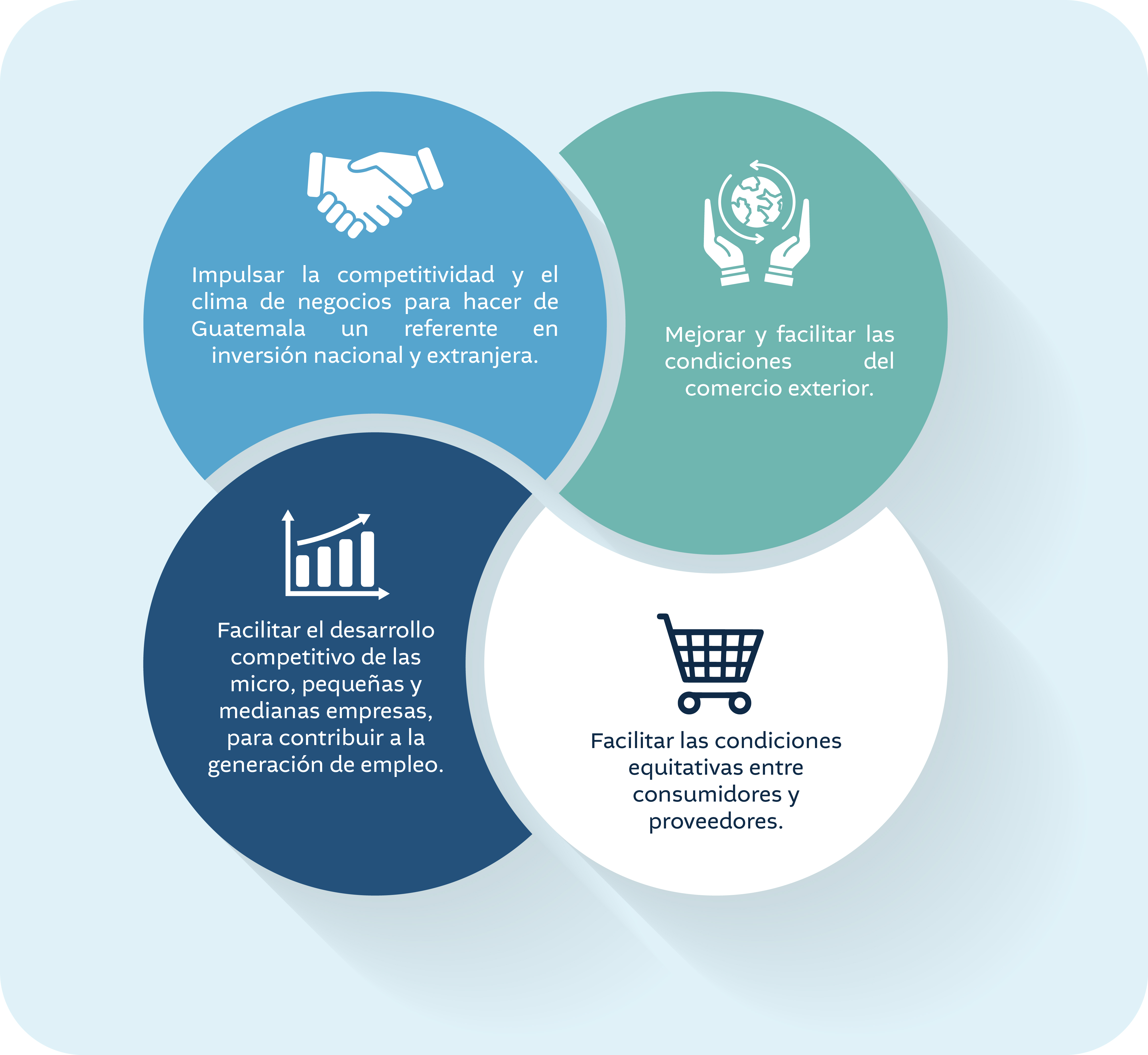 El Ministerio de Economía contribuye a mejorar las condiciones de vida de los guatemaltecos, fortaleciendo a las micro, pequeñas y medianas empresas, garantizando servicios registrables eficientes y transparentes, fomentando la inversión y promoviendo el comercio exterior para impulsar la competitividad del país.