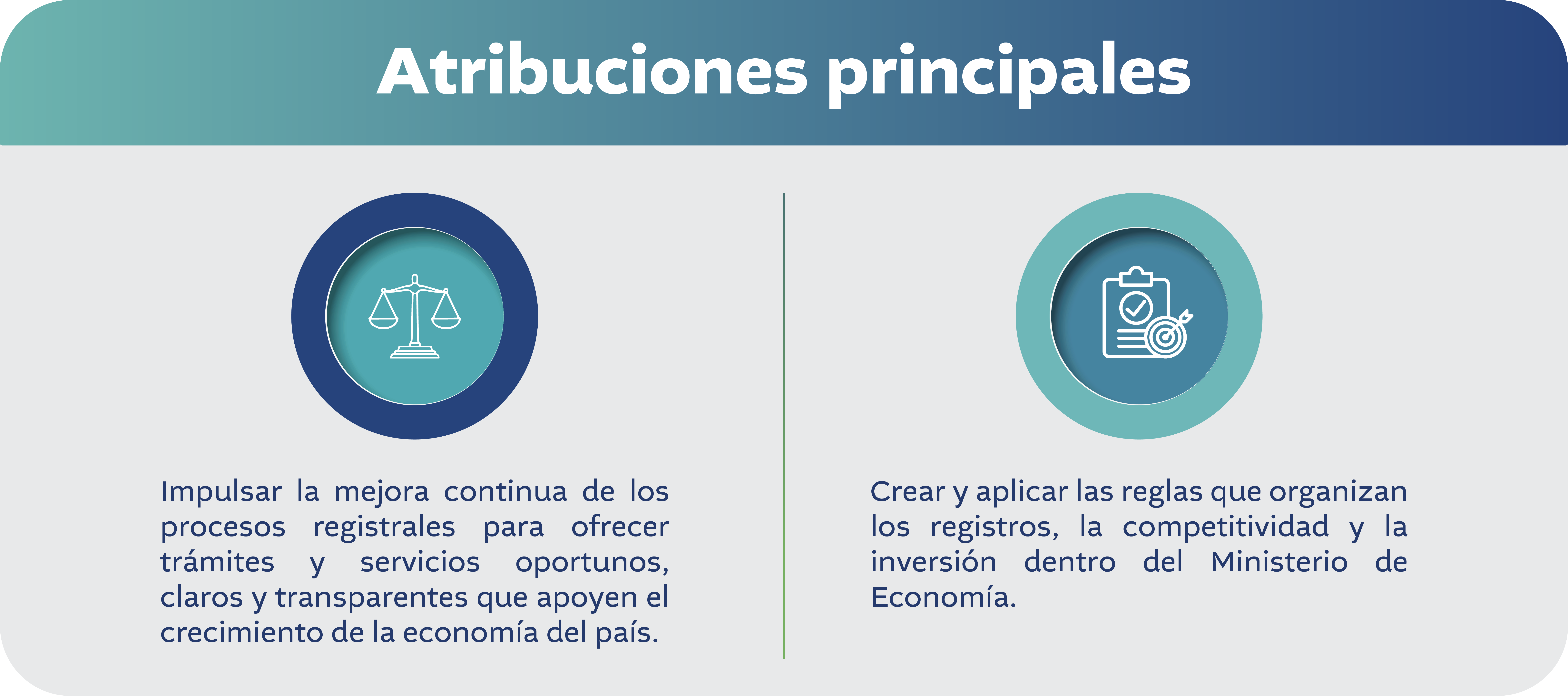 Como ente rector en materia registral, formula y ejecuta políticas que agilizan trámites, modernizan la gestión pública y coordinan el funcionamiento de los registros adscritos al Ministerio de Economía. Además, promueve la mejora continua y la adopción de plataformas digitales seguras, facilitando servicios eficientes que contribuyen directamente al crecimiento económico nacional.