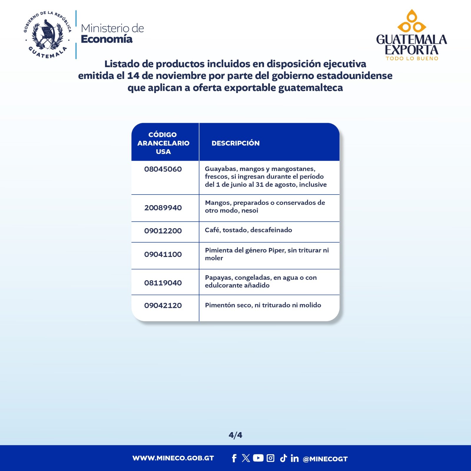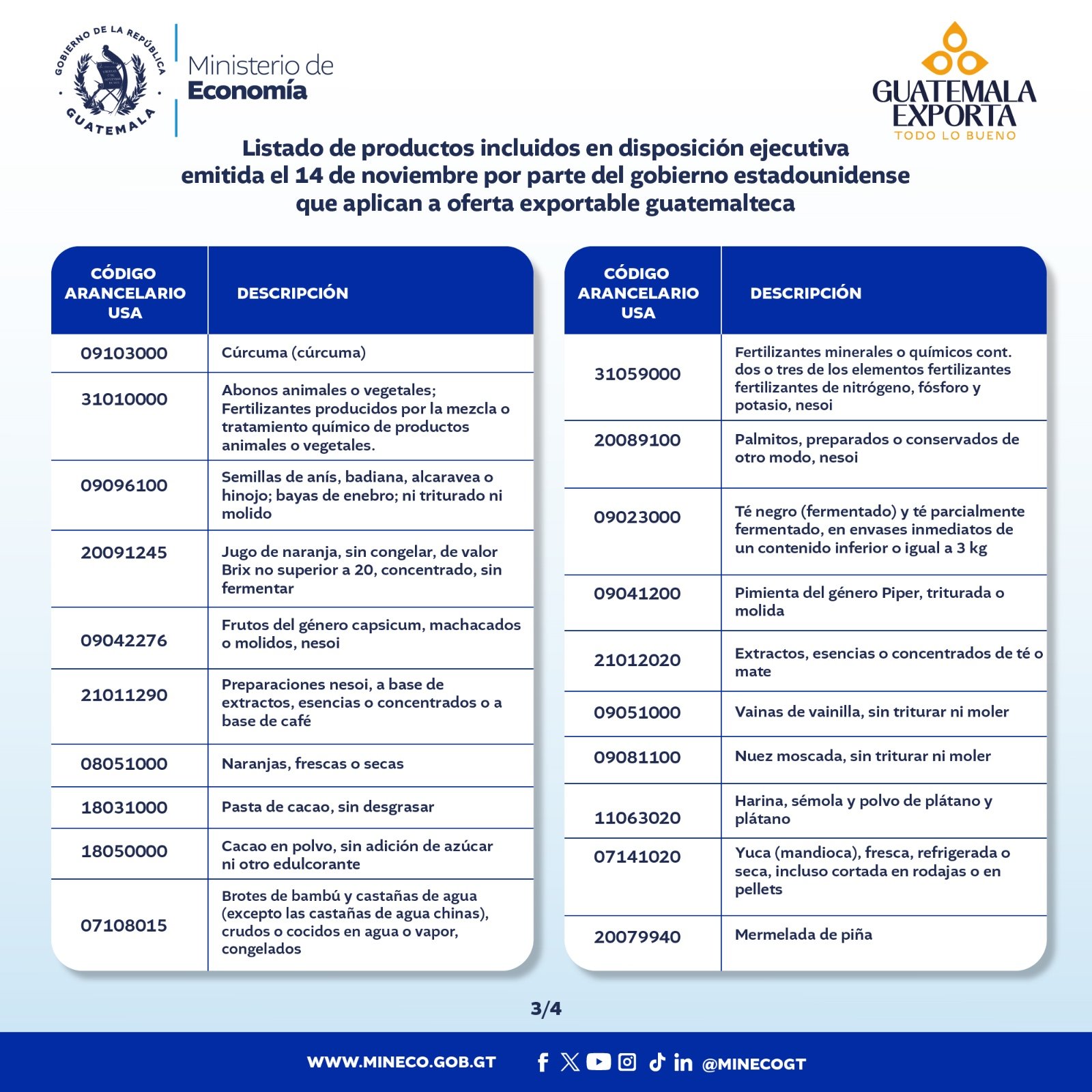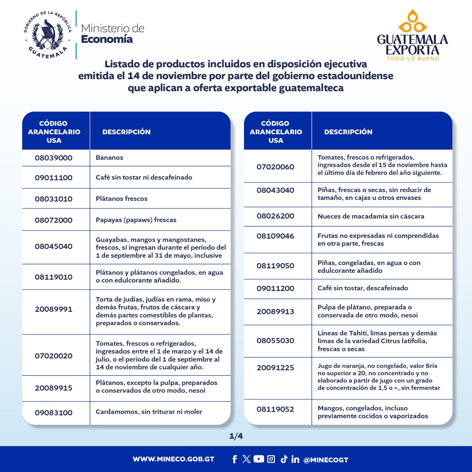 Para Guatemala, los incisos arancelarios que forman parte de esta lista aplican de inmediato, conforme a lo indicado en la orden ejecutiva. El resto de los productos negociados en el Acuerdo de Comercio Recíproco entrará en vigor posteriormente, una vez firmado dicho acuerdo, tal como se estableció en las negociaciones bilaterales.