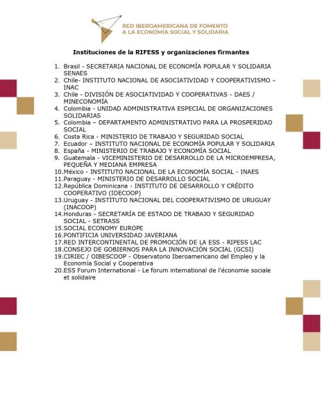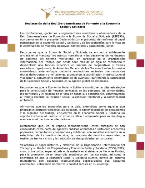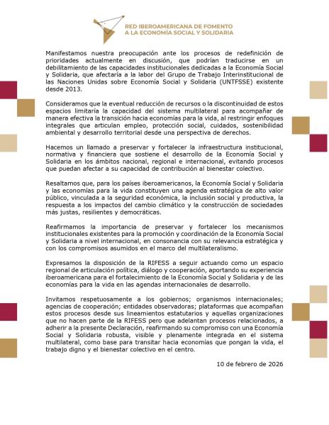 En ese contexto, se remite la primera declaración pública emitida por los países miembros de la Red, mediante la cual se enfatiza la importancia de mantener la Economía Social y Solidaria en la agenda de las Naciones Unidas y de la Organización Internacional del Trabajo (OIT), así como de respaldar la continuidad y sostenibilidad de los esfuerzos técnicos vinculados a este enfoque.