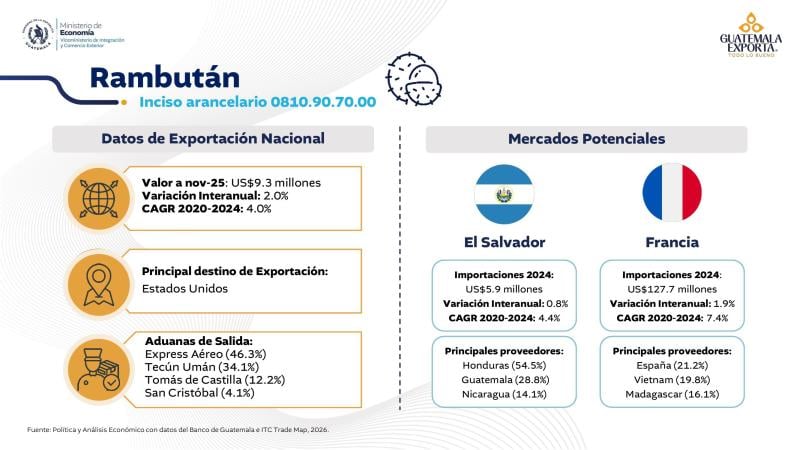El estudio revela que en 2025 Quetzaltenango registró USD$52.2 millones en intención de exportación, destacando productos con dinamismo comercial como ron (USD$21.4 millones), plátanos frescos, cauchos naturales y rambután.