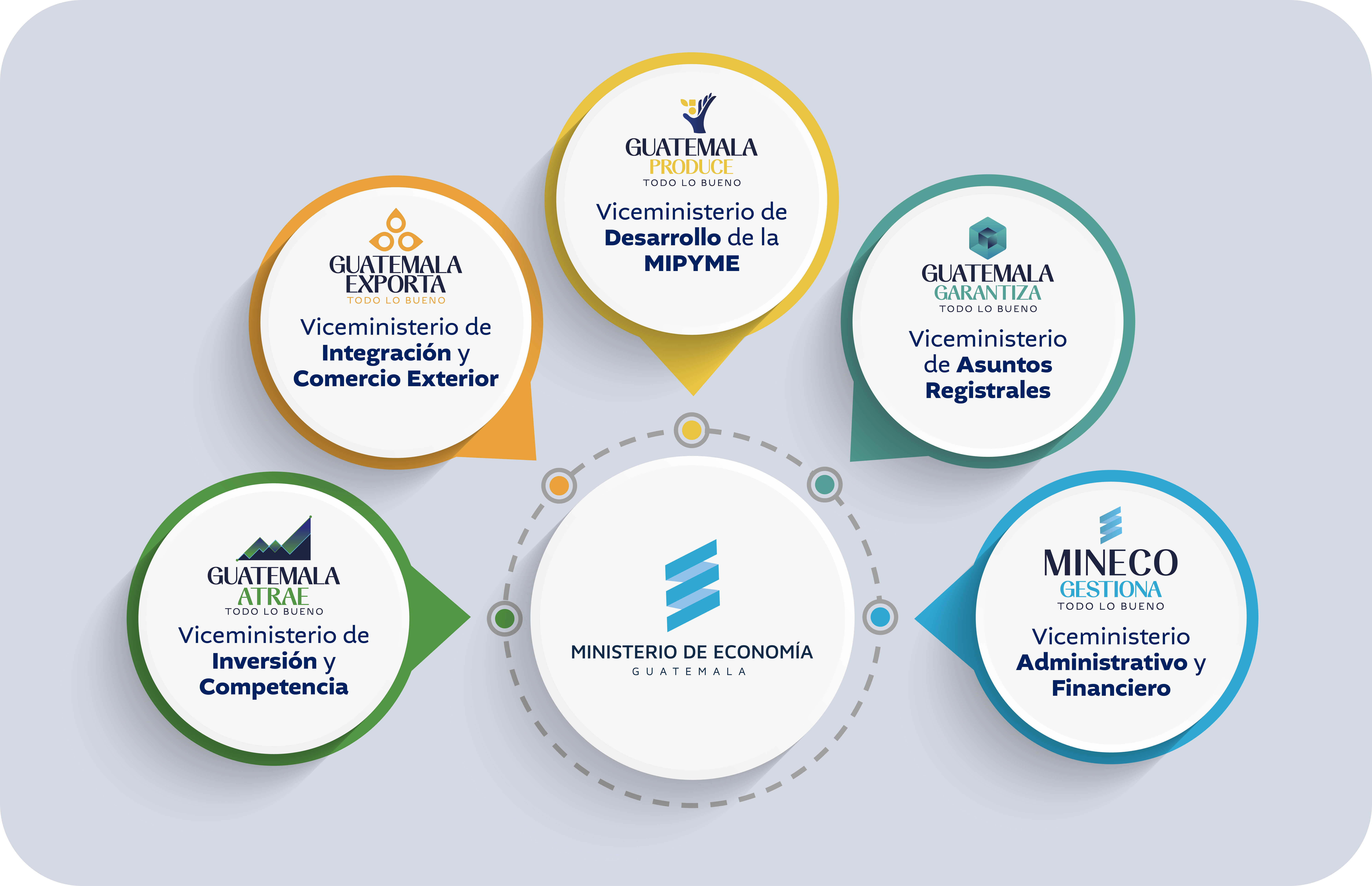 El Ministerio de Economía contribuye a mejorar las condiciones de vida de los guatemaltecos, fortaleciendo a las micro, pequeñas y medianas empresas, garantizando servicios registrables eficientes y transparentes, fomentando la inversión y promoviendo el comercio exterior para impulsar la competitividad del país.