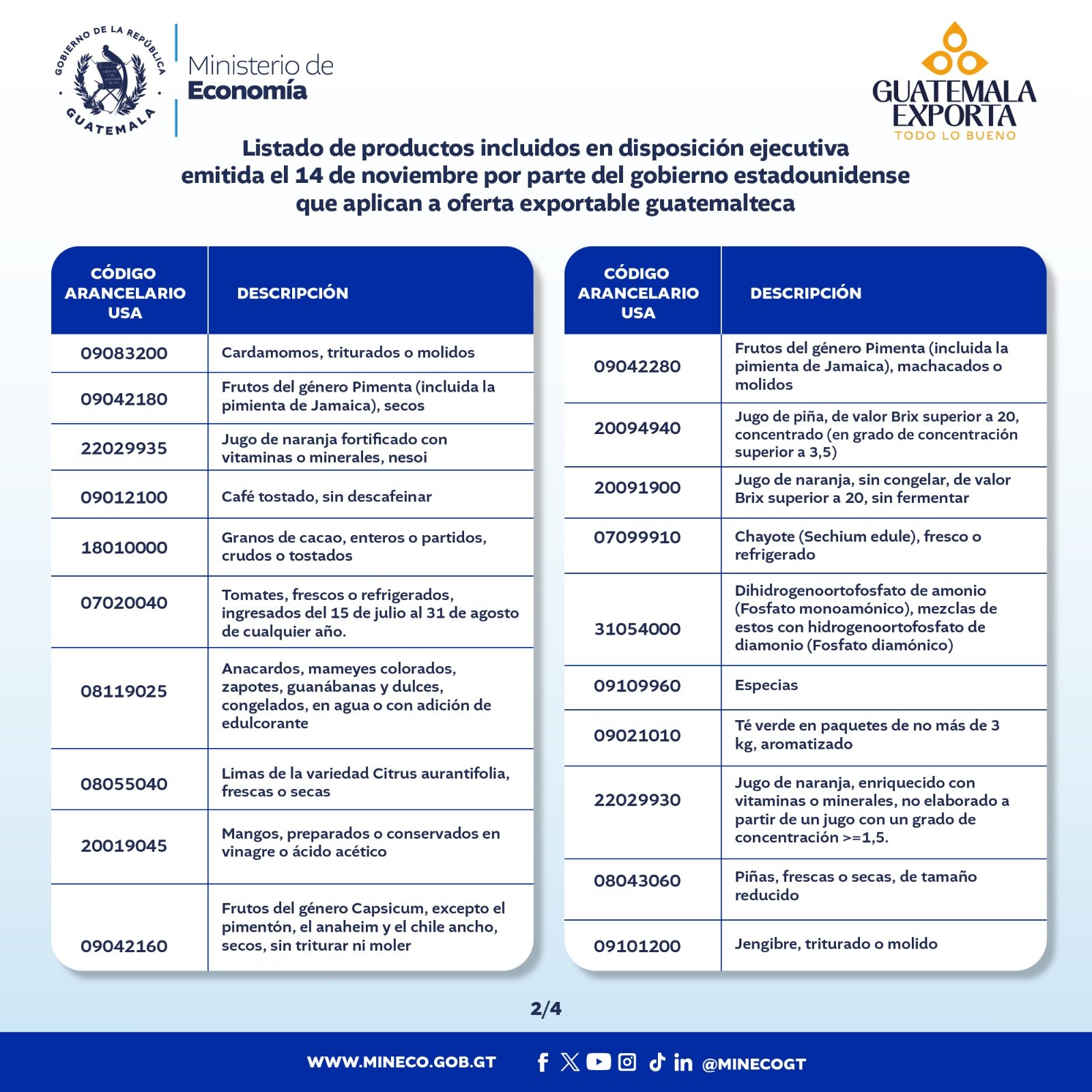 Para Guatemala, los incisos arancelarios que forman parte de esta lista aplican de inmediato, conforme a lo indicado en la orden ejecutiva. El resto de los productos negociados en el Acuerdo de Comercio Recíproco entrará en vigor posteriormente, una vez firmado dicho acuerdo, tal como se estableció en las negociaciones bilaterales.